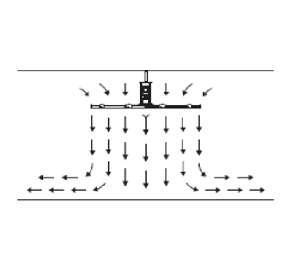 氣流到達地面后偏轉向外輻射, 氣流遇到墻或設備阻擋物,氣流開始向上偏轉達到屋頂, 向上的氣流向風扇上方的低壓區域然后在將其拉向地板。這個類似對流。