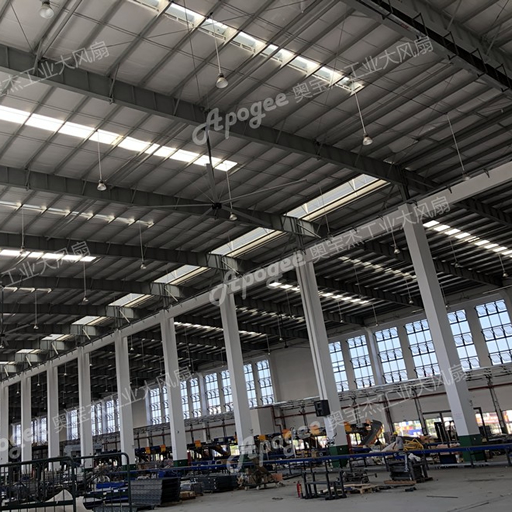 示例圖為湖南一家國(guó)有企業(yè)生產(chǎn)機(jī)電零部件車間,典型的鋼結(jié)構(gòu)建筑。長(zhǎng)度150米, 寬度72米面積10800平米共三跨。 屋面離地高度15米,在沒(méi)有吊扇改造前,工廠采用98臺(tái)工業(yè)小風(fēng)扇(強(qiáng)力風(fēng)扇,牛角扇)改善員工工作環(huán)境。 然而高溫季節(jié),環(huán)境溫度34-39度時(shí), 部分小風(fēng)扇應(yīng)用覆蓋距離和面積有限, 部分員工近距離靠著小風(fēng)扇長(zhǎng)時(shí)間強(qiáng)風(fēng)環(huán)境下產(chǎn)生不適反應(yīng),原有的通風(fēng)降溫不能解決問(wèn)題, 另外隨著工廠安全管理需要小風(fēng)扇由于電纜和潛在靠近旋轉(zhuǎn)扇葉的風(fēng)險(xiǎn)也不適應(yīng)工廠未來(lái)發(fā)展工廠需要有一個(gè)性價(jià)比高的通風(fēng)降溫解決方案, 根據(jù)工廠要求, 奧寶杰實(shí)地了解原有車間環(huán)境, 從廠房面積, 高度, 設(shè)備人員布局的整體考慮,優(yōu)化吊扇布局和氣流, 使用了18臺(tái)奧寶杰(Apogee) TM-7300 (直徑7.3米)進(jìn)行環(huán)境改善。